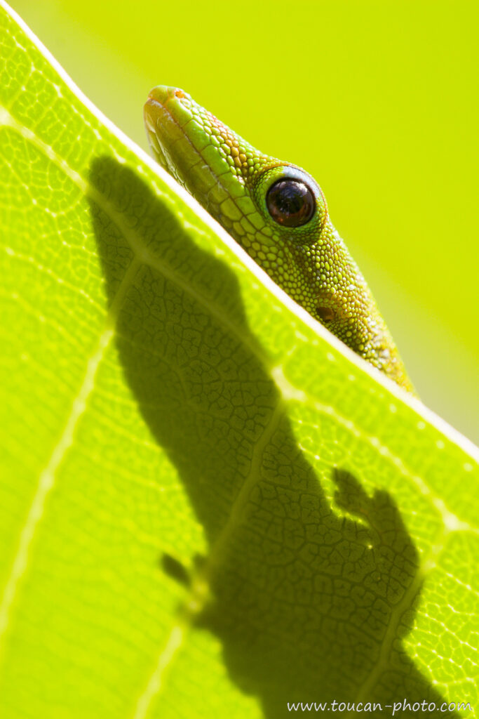 ile de la réunion, côte ouest, saint gilles les bains, france, DOM, PHELSUMA LATICAUDA Margouillat poussière d’or, cache-cache, caché derrière une feuille, reptile