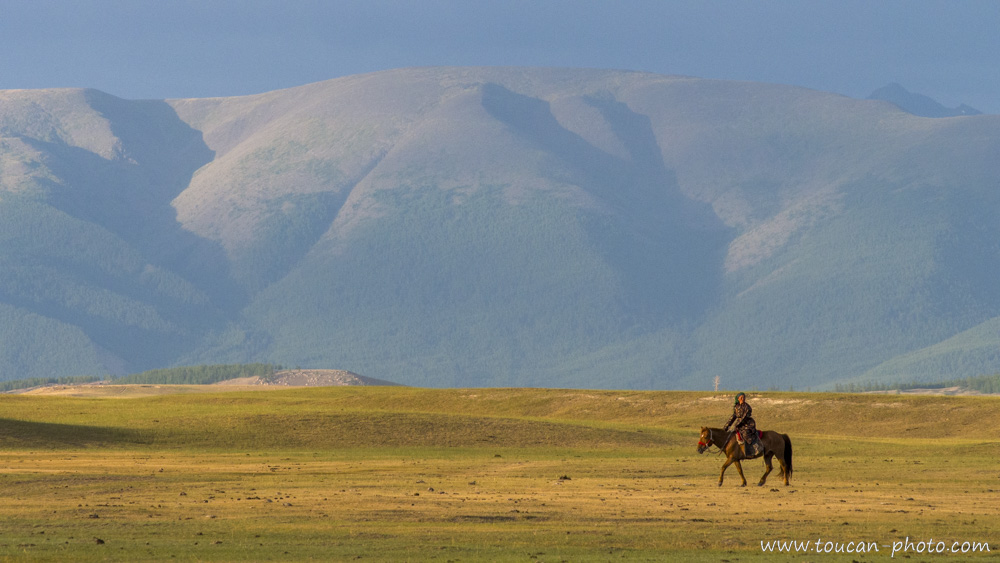 A Darkhad rider (a mongolian ethnic group living in the area) bringing together a herd of horses. As him, today, more and more horse riders prefer to use motorbikes for some tasks as to follow the herd.